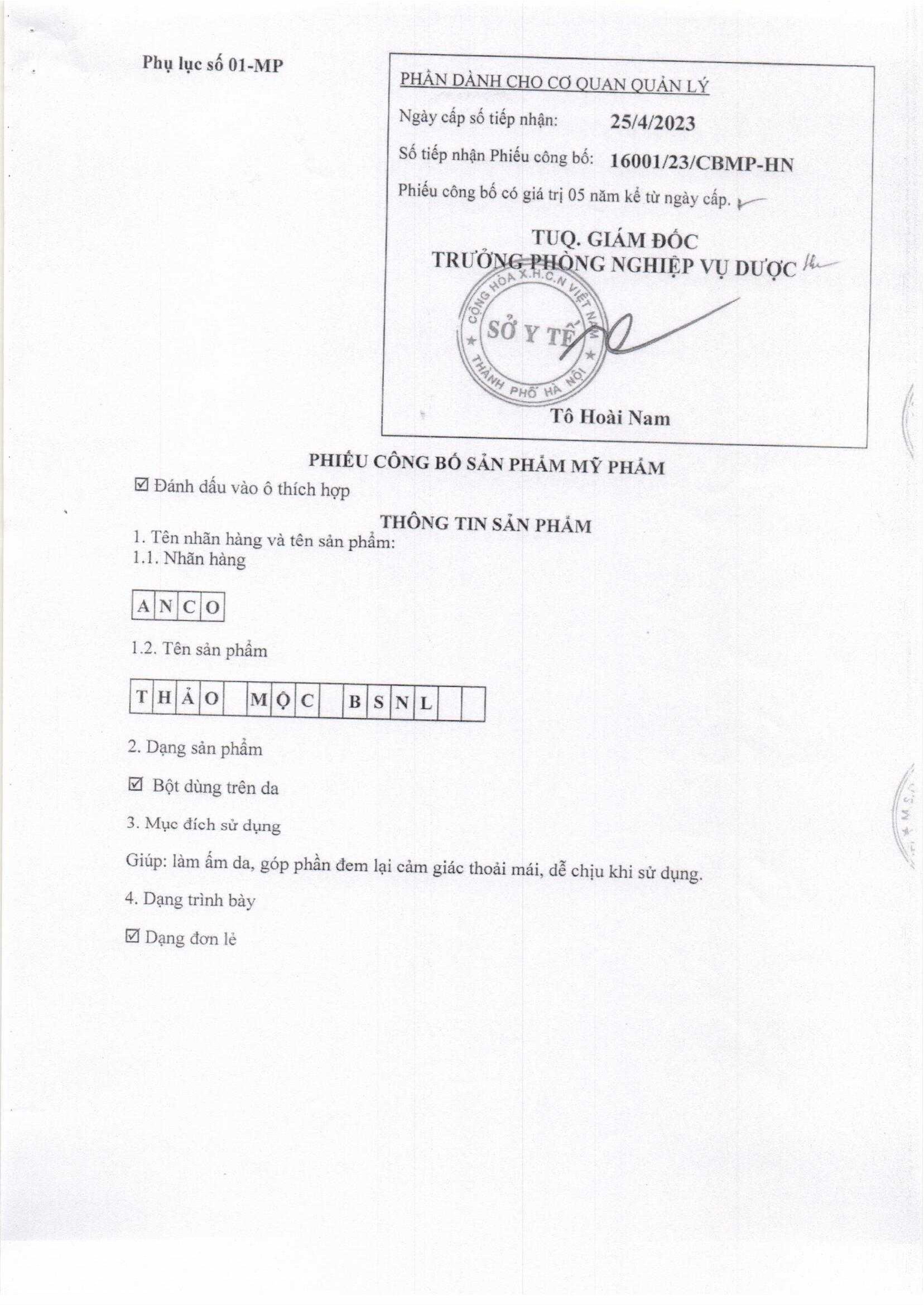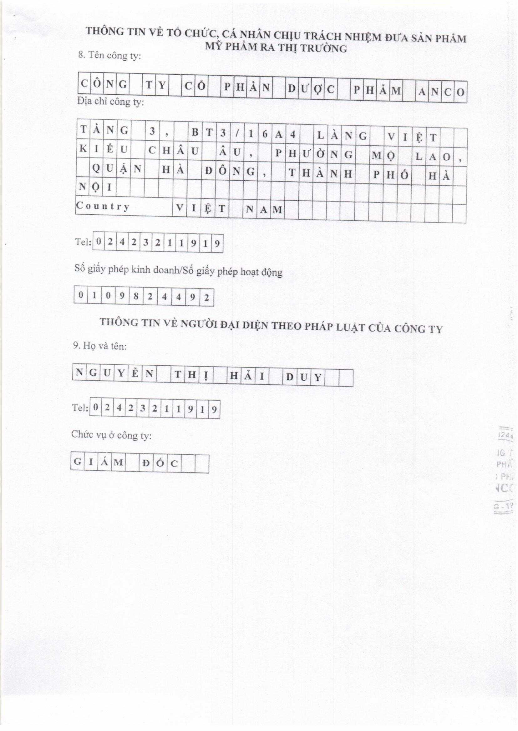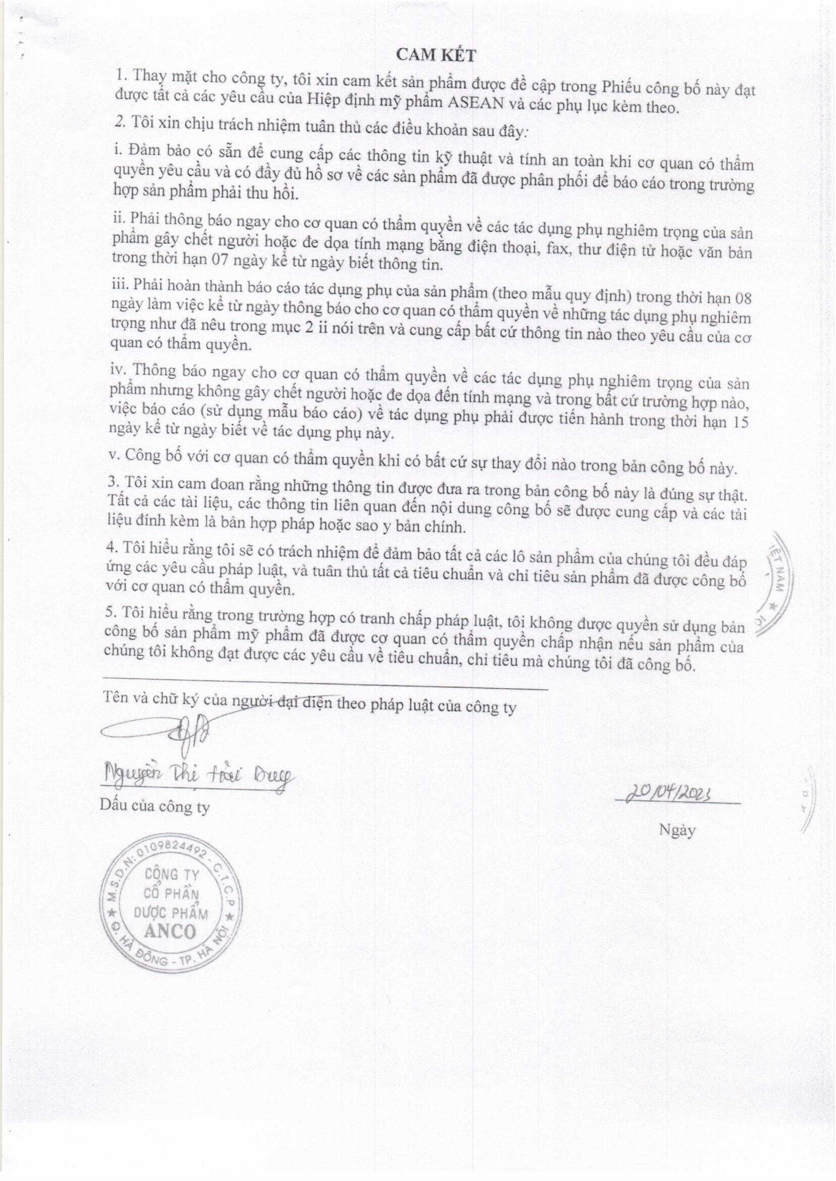 Sản phẩm đã được công bố phù hợp với các nguyên tắc và tiêu chuẩn "Thực hành tốt sản xuất mỹ phẩm" của Hiệp hội các nước Đông Nam Á (CGMP-ASEAN). Công ty Cổ phần Dược phẩm Anco cam kết tuân thủ các quy định hiện hành và chịu trách nhiệm về tính phù hợp của sản phẩm đã công bố.