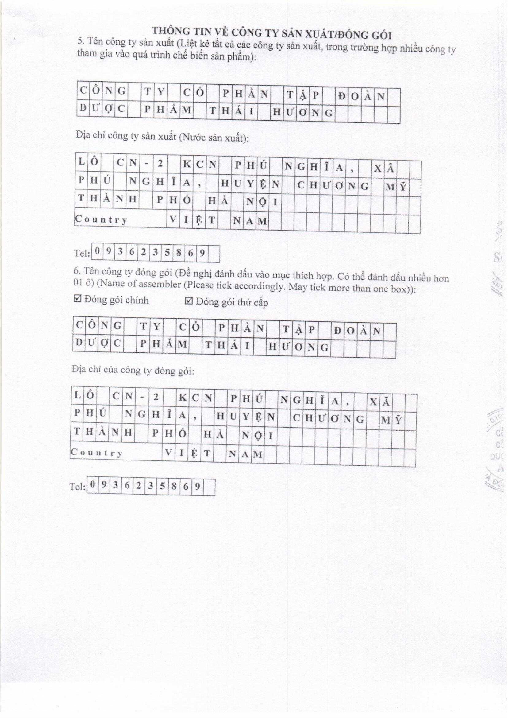Công ty sản xuất và đóng gói: Công ty Cổ phần Tập đoàn Dược phẩm Thái Hương, có địa chỉ tại Lô CN-2, KCN Phú Nghĩa, xã Phú Nghĩa, huyện Chương Mỹ, TP. Hà Nội, Việt Nam.