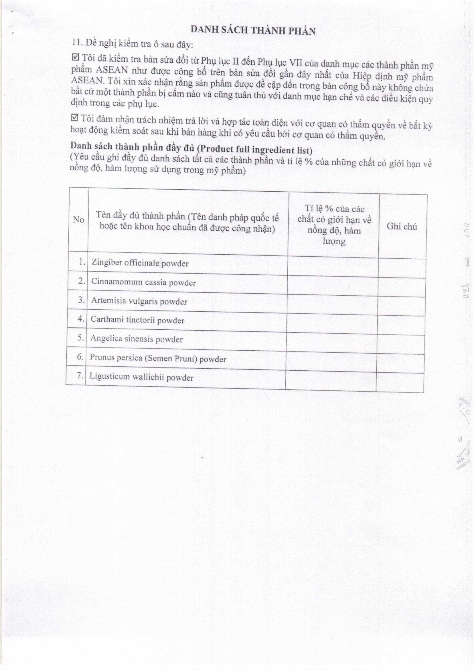 Theo bản công bố, sản phẩm không chứa bất kỳ thành phần bị cấm nào và tuân thủ danh mục hạn chế cũng như các điều kiện quy định trong hiệp định mỹ phẩm ASEAN.