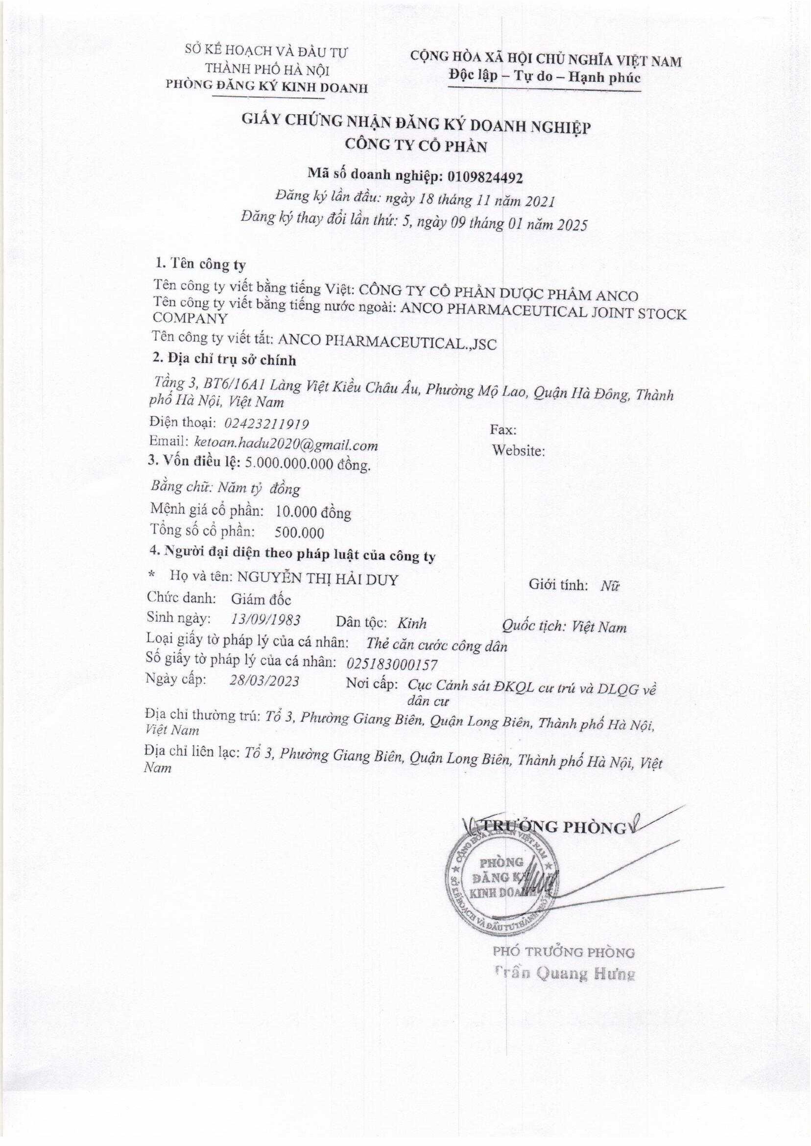Công ty chịu trách nhiệm đưa sản phẩm ra thị trường: Công ty Cổ phần Dược phẩm Anco, có địa chỉ tại Tầng 3, BT3/16A4 Làng Việt Kiều Châu Âu, phường Mộ Lao, quận Hà Đông, TP. Hà Nội, Việt Nam.