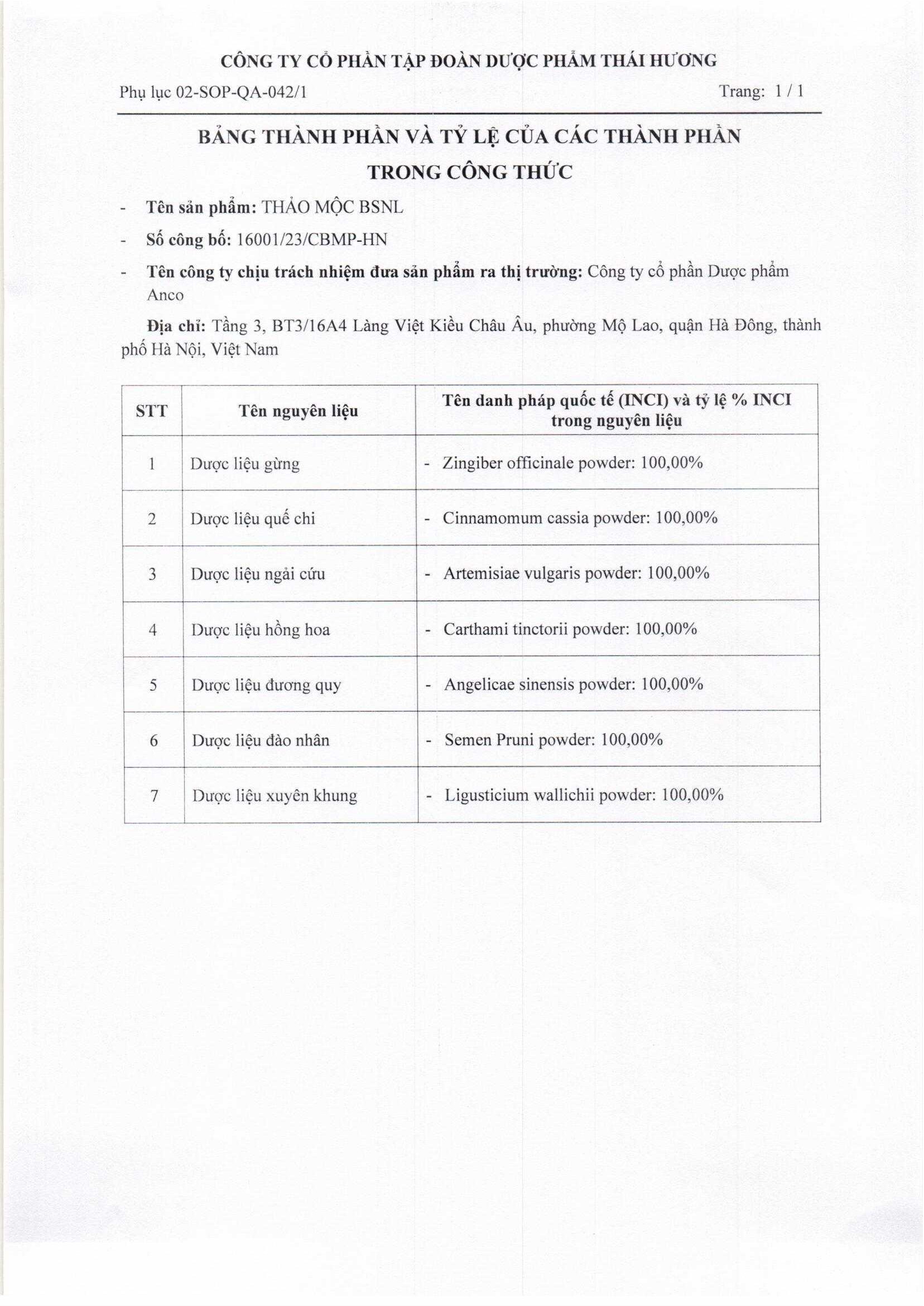Sản phẩm Thảo mộc BSNL có thành phần từ các loại dược liệu tự nhiên. Dưới đây là danh sách đầy đủ các thành phần theo tài liệu công bố: