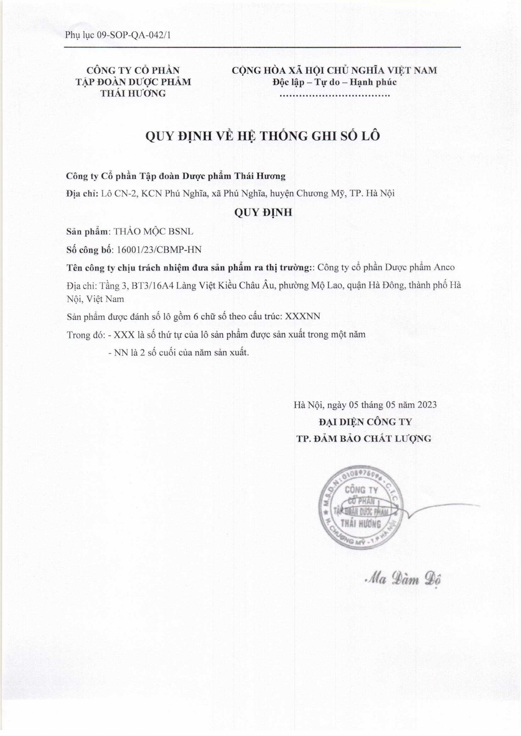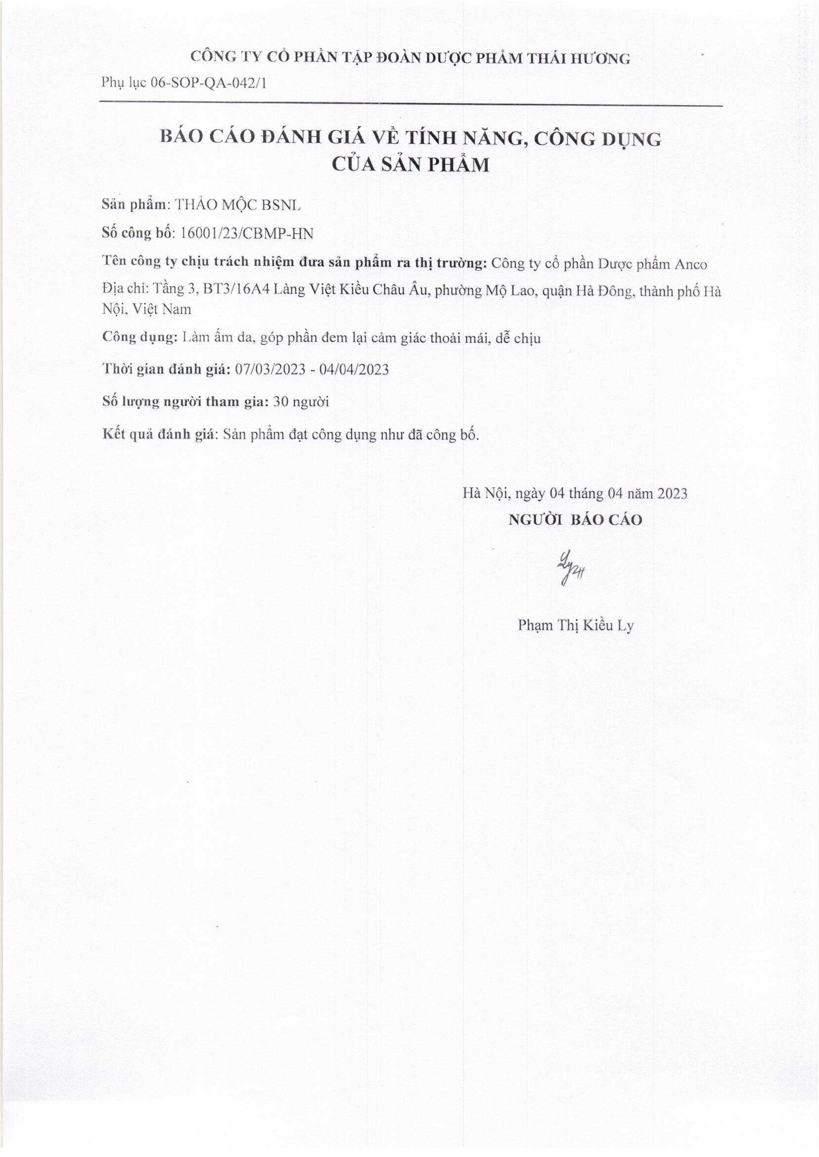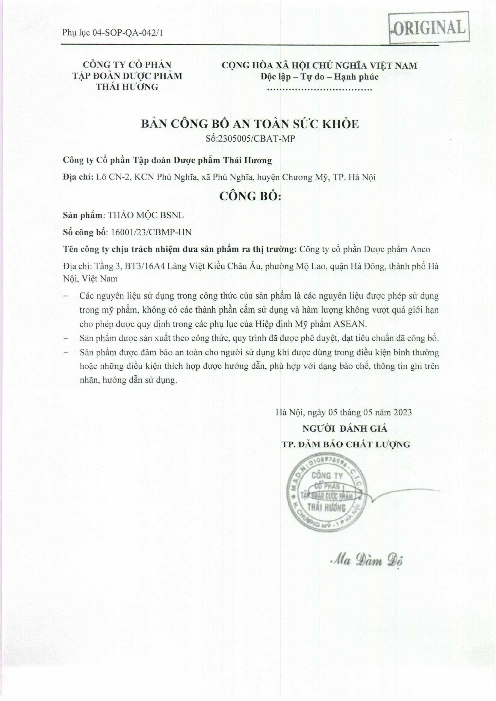 Thảo mộc BSNL là sản phẩm mỹ phẩm dạng bột dùng trên da. Sản phẩm được tạo ra nhằm mục đích làm ẩm da, mang lại cảm giác thoải mái và dễ chịu cho người sử dụng. Phiếu công bố sản phẩm được cấp bởi Sở Y tế Hà Nội vào ngày 25/04/2023 và có giá trị trong vòng 5 năm kể từ ngày cấp.
