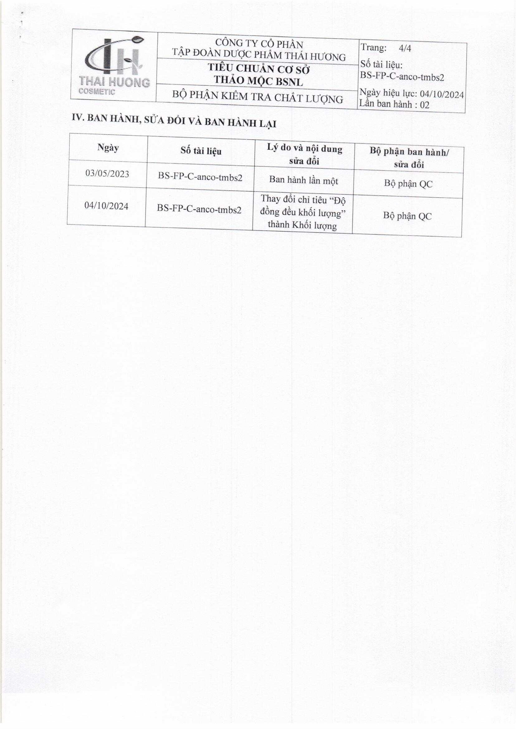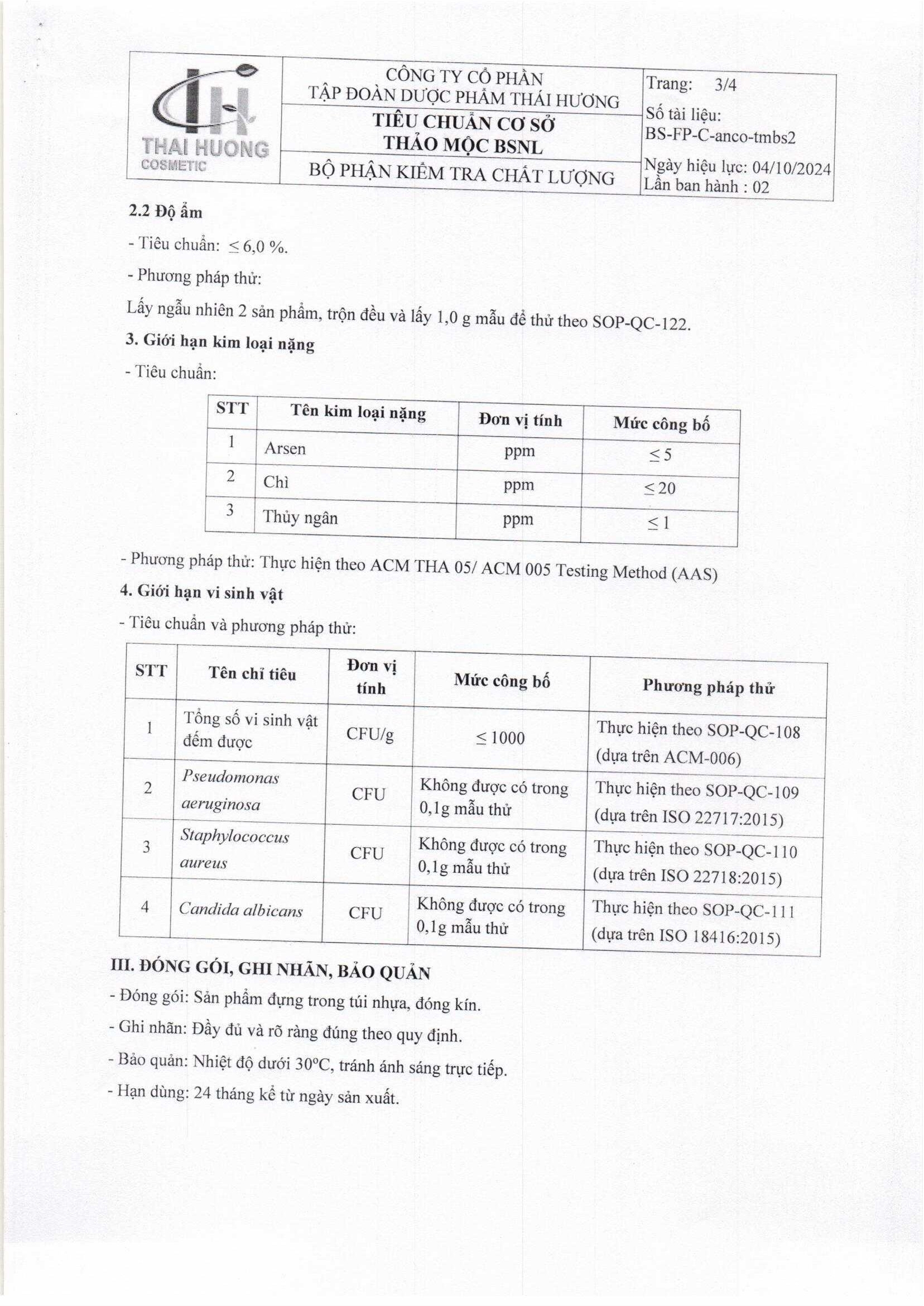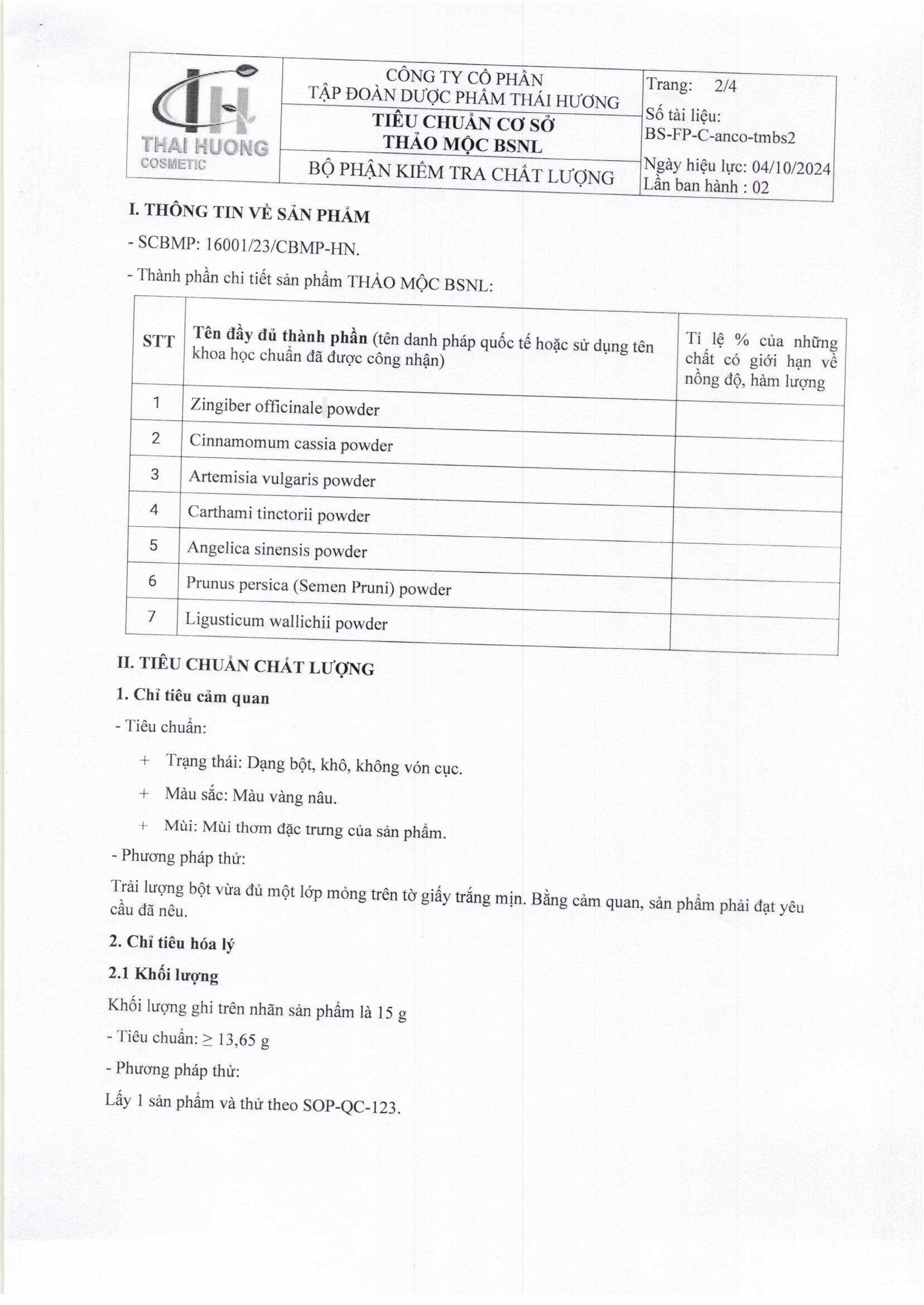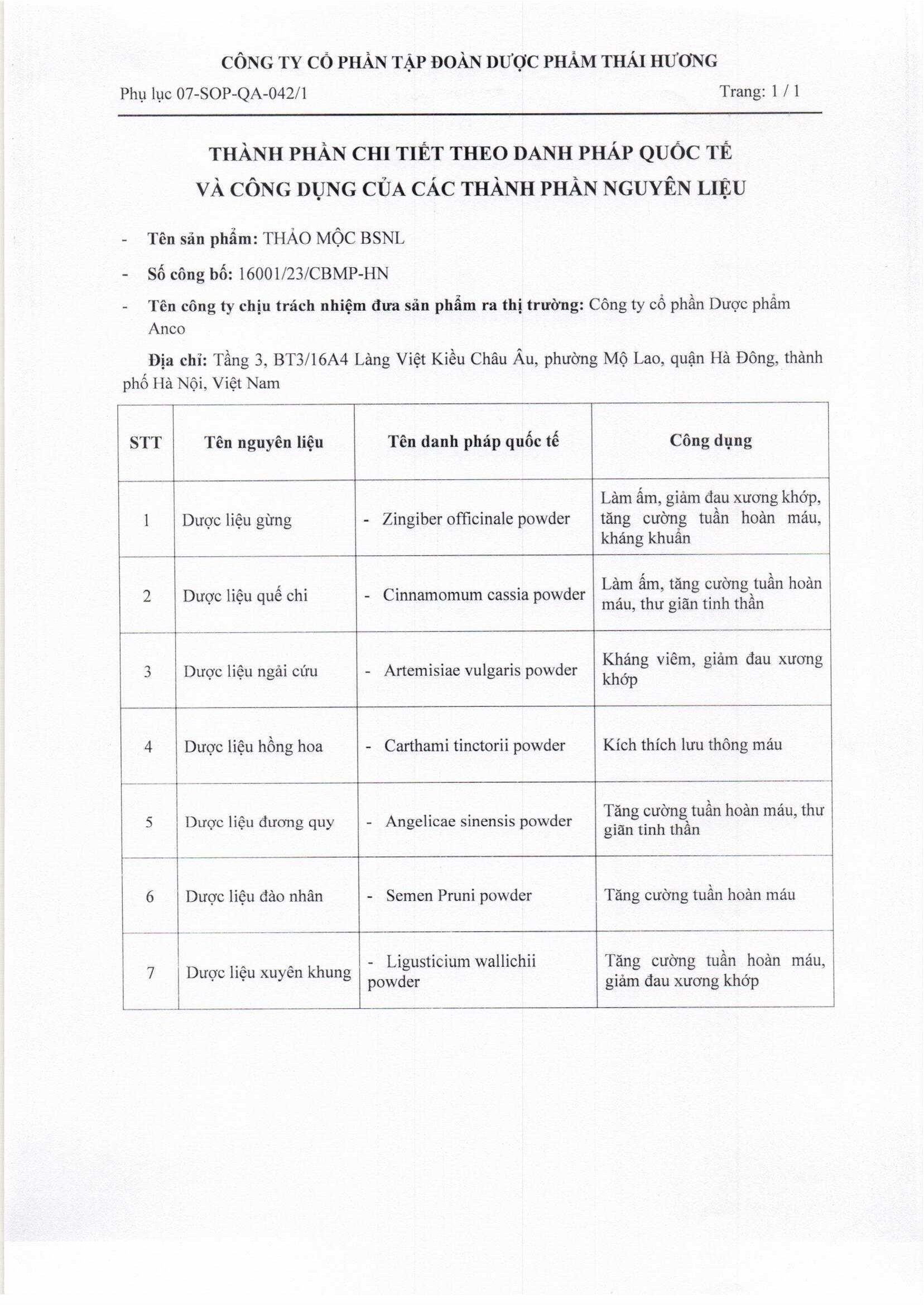 Phiếu kiểm nghiệm cũng xác nhận công dụng của từng thành phần thảo mộc trong sản phẩm: