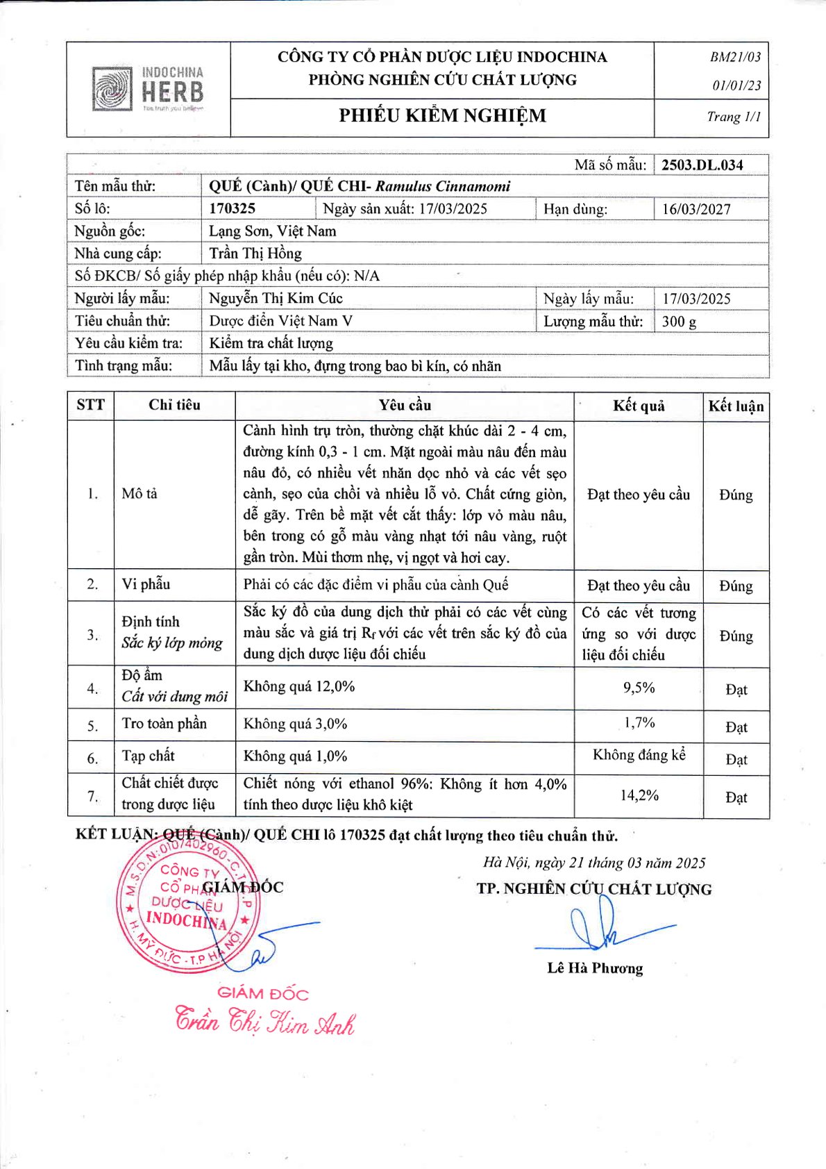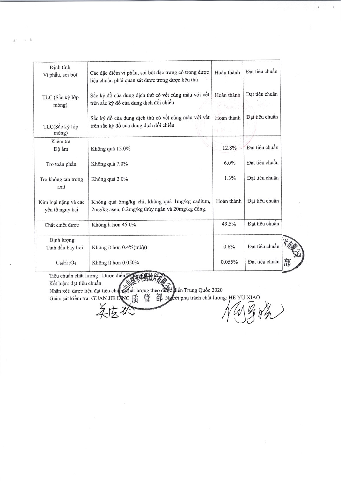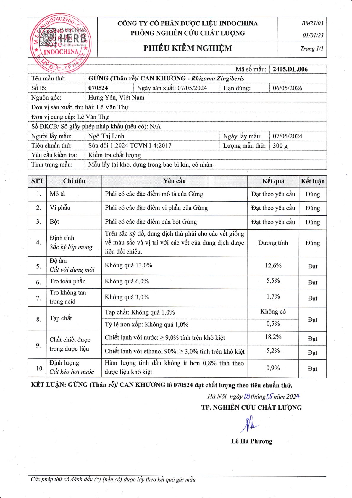 - Định tính: Các phiếu kiểm nghiệm đều xác nhận rằng các mẫu thử đều dương tính hoặc phù hợp với các đặc điểm định tính của dược liệu tương ứng, thường được kiểm tra bằng phương pháp sắc ký lớp mỏng.
