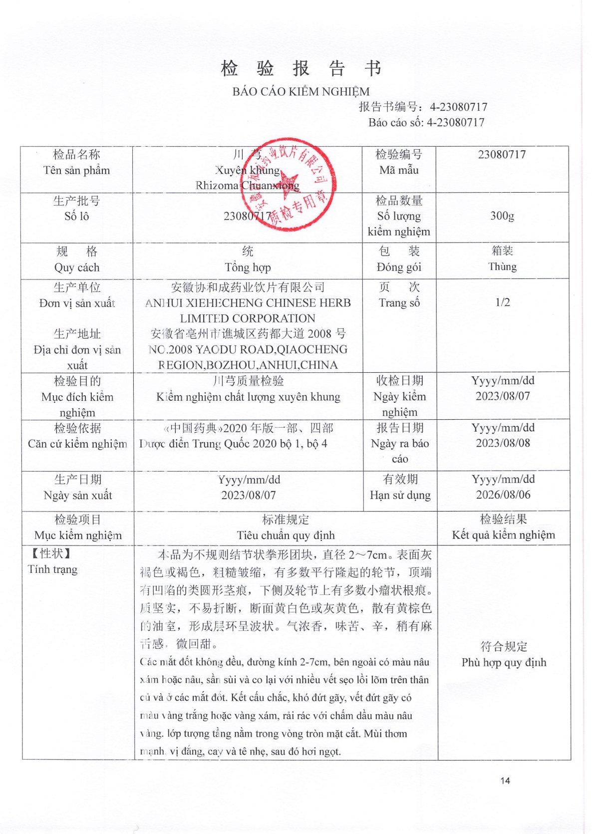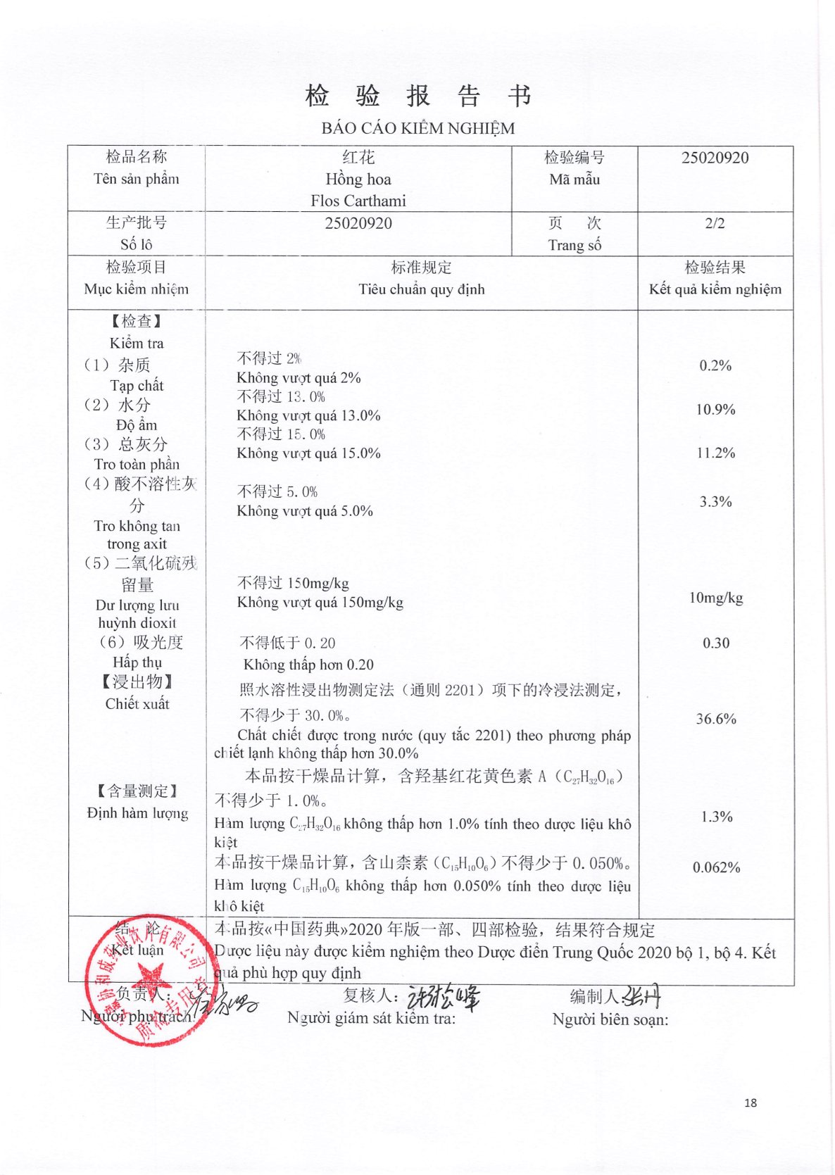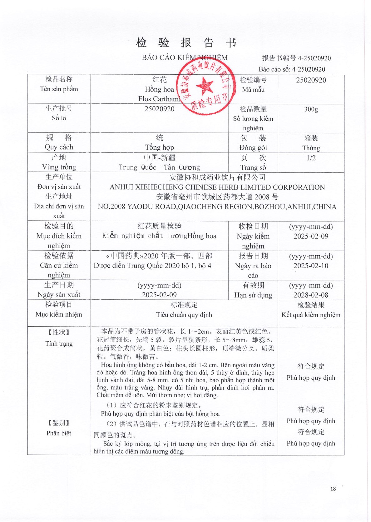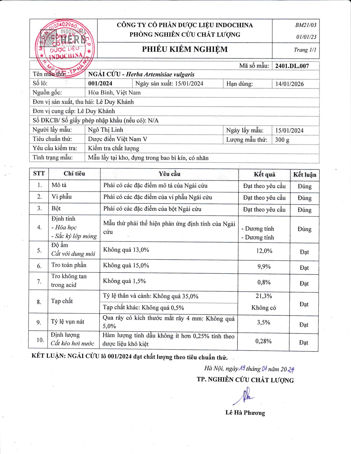 - Định tính: Các phiếu kiểm nghiệm đều xác nhận rằng các mẫu thử đều dương tính hoặc phù hợp với các đặc điểm định tính của dược liệu tương ứng, thường được kiểm tra bằng phương pháp sắc ký lớp mỏng.
