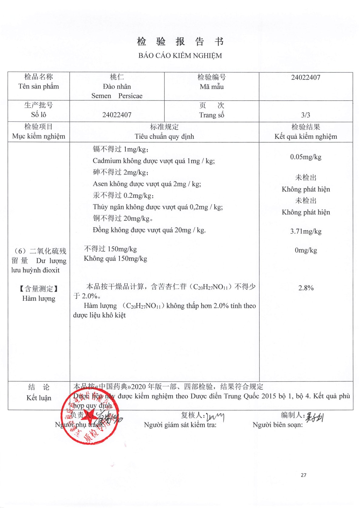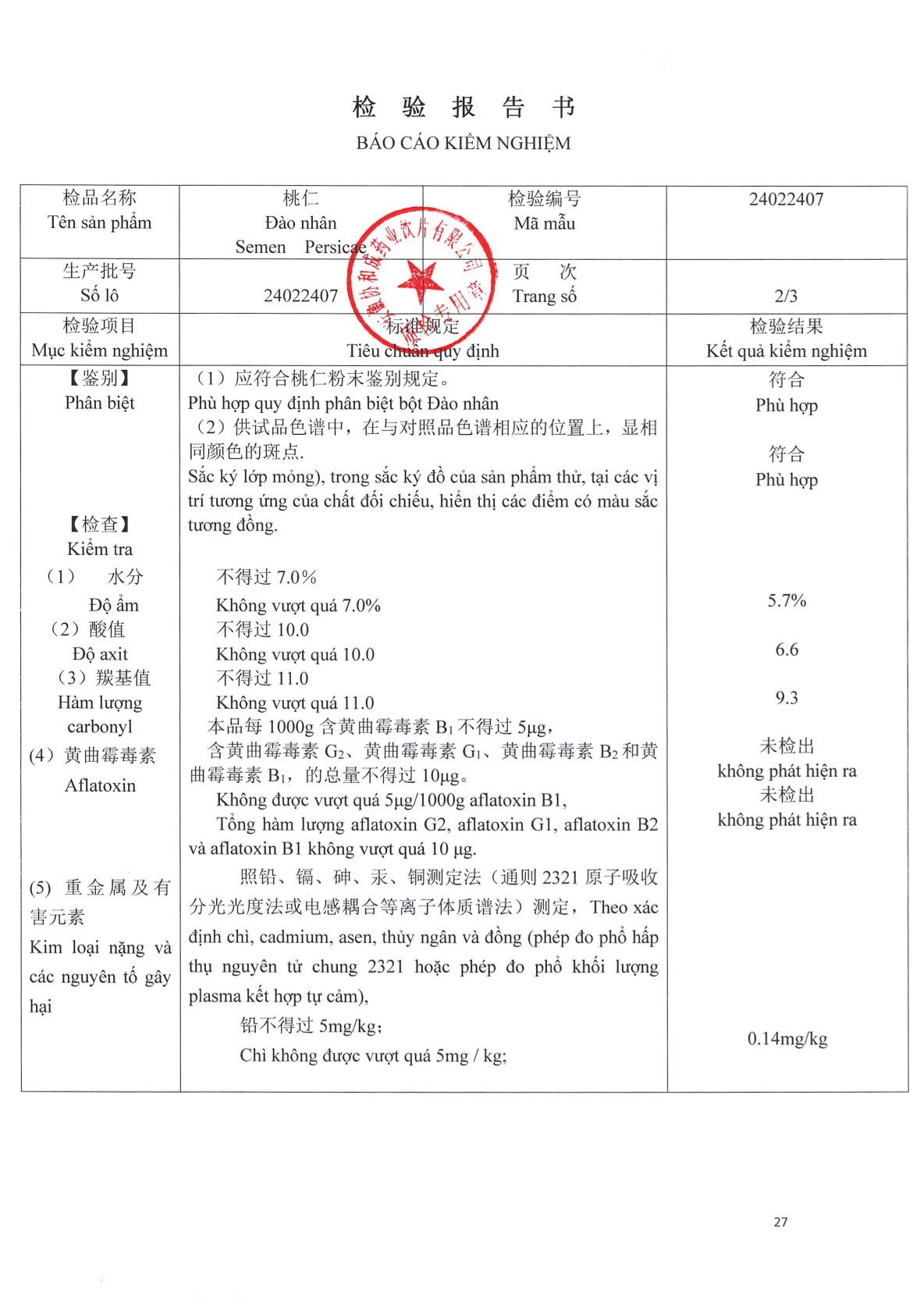 - Kim loại nặng: Một số nguyên liệu như đào nhân có kết quả kiểm nghiệm kim loại nặng (Chì, Cadmium, Asen, Thủy ngân) đều thấp hơn giới hạn cho phép.