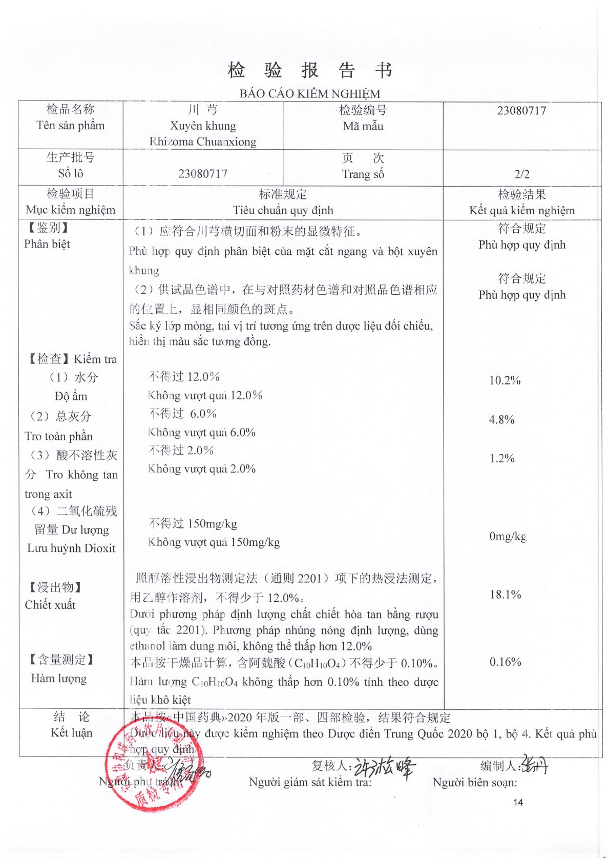 - Tro toàn phần và Tro không tan trong axit: Các chỉ số này cũng được kiểm tra và đều nằm trong giới hạn cho phép, đảm bảo độ tinh khiết của nguyên liệu.